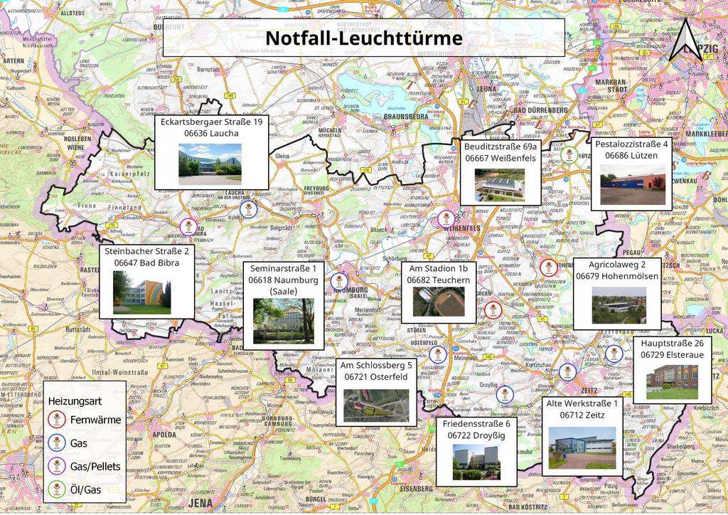 Die Notfall-Leuchttürme sind über den gesamten Burgenlandkreis verteilt, im Dunkeln gut erkennbar und zu Fuß zu erreichen. Notfall-Leuchttürme werden vom Burgenlandkreis eingerichtet und gemeinsam mit den Städten, Verbands- und Einheitsgemeinden betrieben und sind mit Personal besetzt. Im Krisenfall sind die Notfall-Leuchttürme Ihre Anlaufstelle für Informationen und Versorgung.