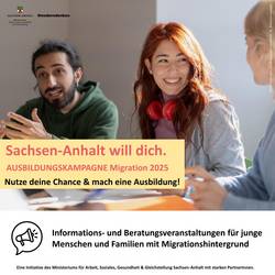 „Sachsen-Anhalt will dich.“ ist eine Initiative des Ministeriums für Arbeit, Soziales, Gesundheit und Gleichstellung Sachsen-Anhalt, umgesetzt gemeinsam mit Partnern wie der Agentur für Arbeit, den Industrie- und Handelskammern, den Handwerkskammern sowie der KAUSA-Servicestelle.