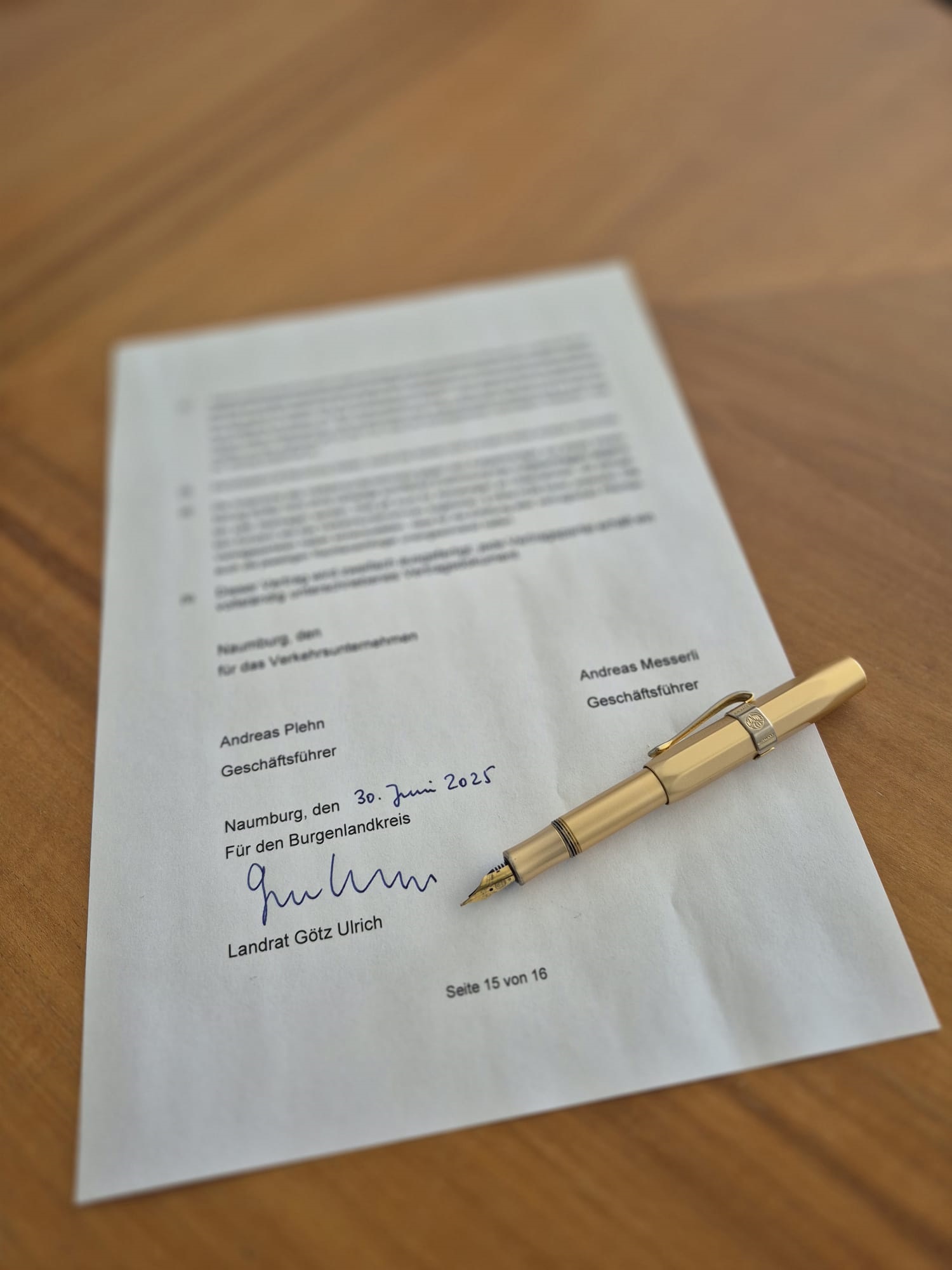 Seit Ende Juni wartet man im Landratsamt auf eine Unterschrift der Naumburger Straßenbahn GmbH (NSB). Seit dieser Zeit sind die rechtlichen Grundlagen erarbeitet, um der NSB den vom Kreistag bewilligten jährlichen zusätzlichen Zuschuss von 120.000 Euro aus dem Kreishaushalt zahlen zu können. Landrat Götz Ulrich hatte Ende Juni die sogenannte Dienstleistungskonzession an die Geschäftsführer der NSB übergeben und erklärt, dass diese Vereinbarung aus Sicht des Landkreises sofort unterschrieben werden kann. Dies ist bis heute von Seiten der NSB nicht passiert.