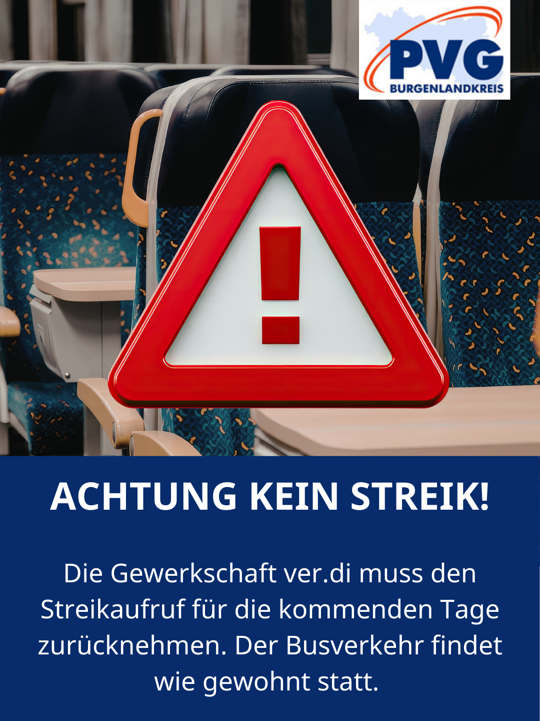 Kein Streik im Burgenlandkreis Nach einem von der PVG Burgenlandkreis angestrebten Verfahren vor dem Arbeitsgericht Halle muss die Gewerkschaft ver.di ihren geplanten viertägigen Streik zurücknehmen. Der Linien- und Schülerverkehr wird planmäßig fahren. Wir bitten um Beachtung.