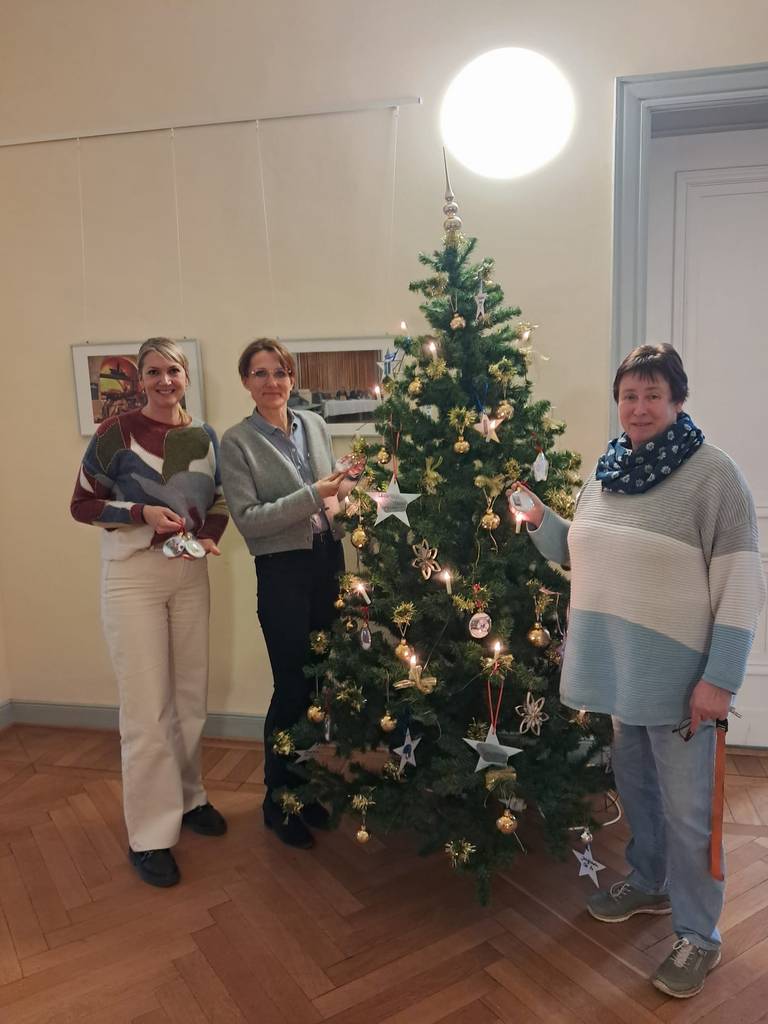 Veterinäramtsleiterin Dr. Caroline Hofbeck, die stellvertretende Landrätin Dr. Ariane Körner und Umweltamtsmitarbeiterin Ute Wolf (v.l.) an dem Wünschebaum im Landratsamt Weißenfels.