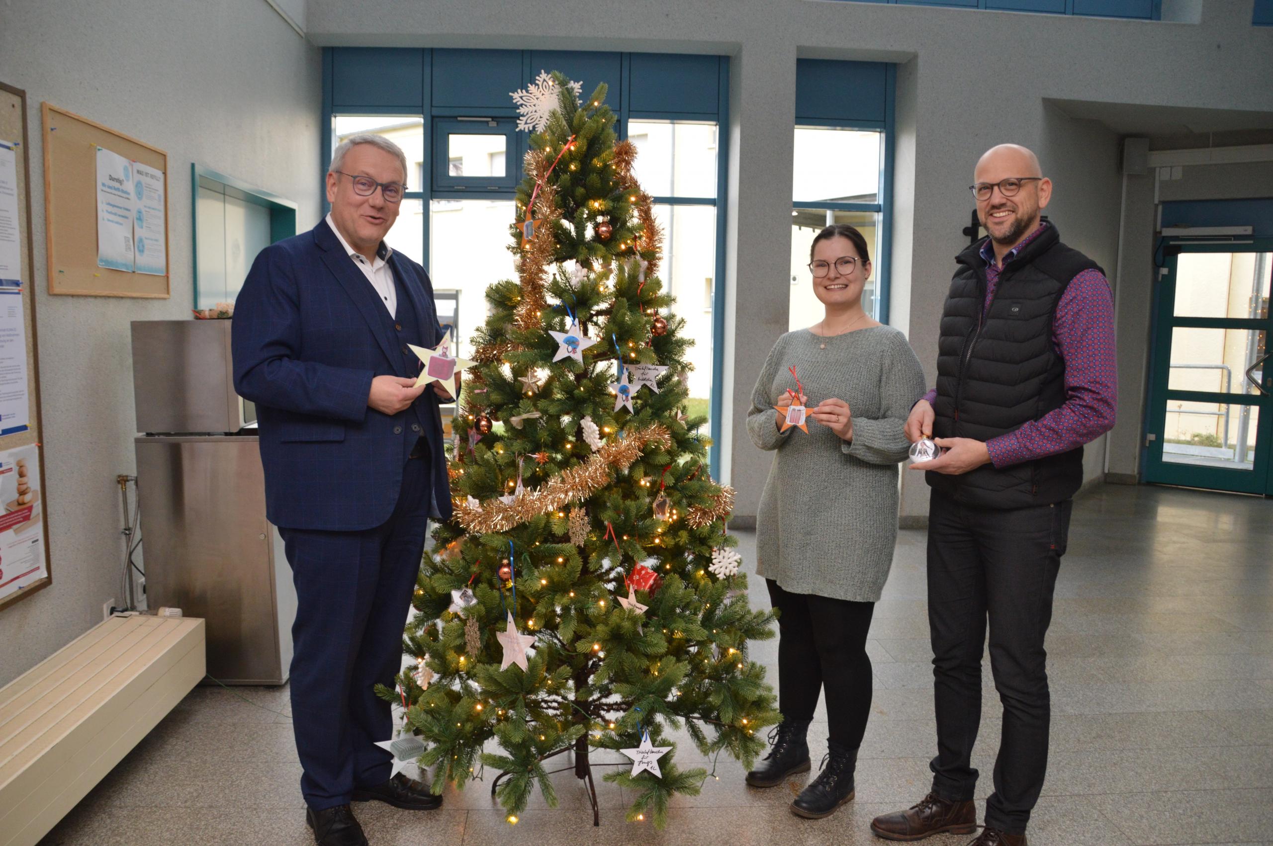 Landrat Götz Ulrich, Personalratsvorsitzender Ronny Just und Heimleiterin Lisa Stieber (v.l.) stehen an dem Wünschebaum im Landratsamt Naumburg.
