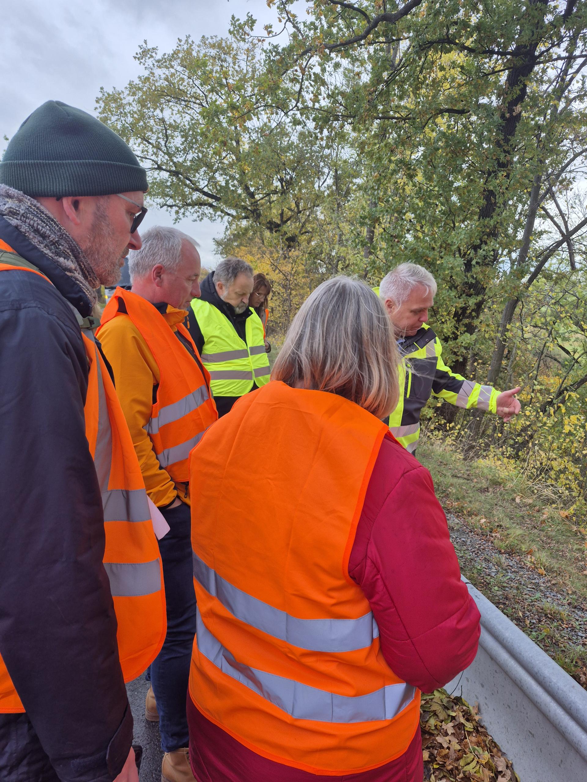 Mitglieder des Petitionsausschusses des Landtages von Sachsen-Anhalt sind am 27. Oktober 2025 an der Landesstraße 204 (L 204) bei Schönburg zusammengekommen. Im Beisein der stellvertretenden Landrätin Dr. Ariane Körner, der Landtagsabgeordneten Rüdiger Erben, Maximilian Gludau und Daniel Sturm, Naumburgs Oberbürgermeister Armin Müller und Karsten Stützer, Bürgermeister von Schönburg und Petent, sowie Vertretern des Landesministeriums für Infrastruktur und Digitales, der Landesstraßenbaubehörde Sachsen-Anhalt, Polizei und des Straßenverkehrsamtes des Burgenlandkreis machten sich die Ausschussmitglieder vor Ort ein Bild von der Unfallstelle, an der in der Nacht vom 30. Juni zum 1. Juli 2024 drei junge Erwachsene bei einem schweren Verkehrsunfall ihr Leben verloren. Bisher führte kein Weg zur Errichtung von sogenannten Distanzschutzplanken, weshalb diese in der eingereichten Petition „Gemeinsam für mehr Sicherheit an der Landesstraße 204“ gefordert werden.