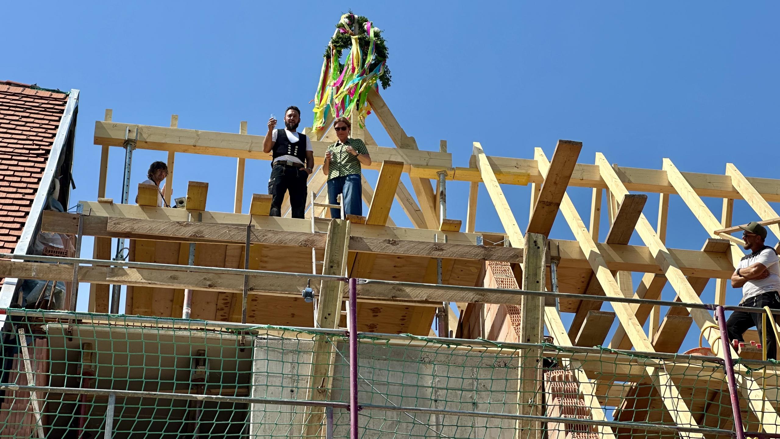 Mit einem Richtfest hat die Stiftung Kloster und Kaiserpfalz Memleben am 14. August 2025 den Baufortschritt bei Abriss und Errichtung eines Neubaus zwischen historischem Ost- und Nordflügel der Klosterklausur gefeiert. Landrat Götz Ulrich, gleichzeitig Vorstand der Stiftung Kloster und Kaiserpfalz Memleben, und Staatssekretär Gert Zender, Ministerium für Wirtschaft, Tourismus, Landwirtschaft und Forsten des Landes Sachsen-Anhalt, zugleich Kuratoriumsmitglied der Stiftung, lauschten gemeinsam dem Richtspruch von Zimmermann Alexander Vins von der Firma BSR Ritschel.